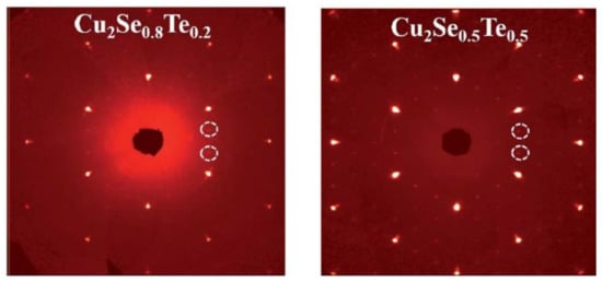 Single Crystal X-ray Diffraction (SXRD) pattern for Cu2Se0.8Te0.2 and Cu2Se0.5Te0.5, the white dashed rings are the super cell diffraction spots indicating the existence of Cu2Te second phase [68].