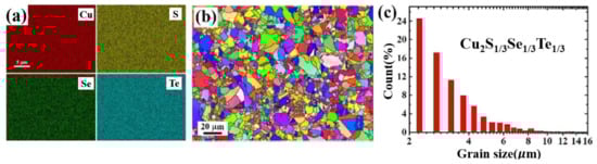 (a) EDS mapping for Cu2S1/3Se1/3Te1/3; (b) Inverse pole figure (IPF) orientation map obtained from Electron Back Scattered Diffraction image (EBSD); (c) Histogram of grain size distribution for the same sample in (b) [71].