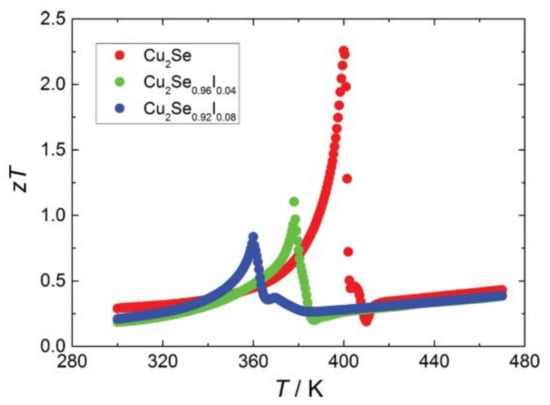 The second phase finding in Cl doped sample can be a promising approach to compensate for the negative effects brought by the unavoidable Cu deficiency. Nevertheless, an unexpected thermal instability is found at temperatures higher than 620 K, due to the low melting point of CuCl [76]. Even so, another discovery made by Huilin Liu et al. might be a way out [77]. In their study, Cu2Se was synthesized through SPS. A high ZT value of 2.3 is achieved at 400 K (shown in Figure 19) due to the phonon critical scattering during phase transition of materials possessing the nature of second-order phase transition. In a study of Br doped Cu2Se, Tristan W. Day et al. put forward that if the hole concentration in Cu2Se can be decreased to an appropriate concentration, the ZT value of Cu2Se can be increased to as high as 1.16 at 305 K theoretically [75]. Thus, halogen doped samples can still possible be made in near-room-temperature TE materials.