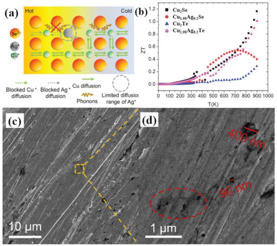 (a) Schematics of Cu+/Ag+ diffusion and phonon scattering. Limited diffusion range of Ag+ further blocks the diffusion of Cu+ ions and weakens the scattering of phonons by cations [78]; (b) Temperature dependence of figure of merit (ZT) and power factors for all sample [79]; (c) SEM image of the samples; (d) magnified image of the yellow dashed square region in (c), region marked in red dashed ellipses are pores form during SPS process [80].