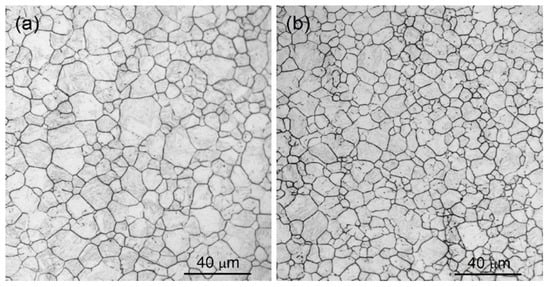 The optical morphologies of prior austenite grains after water quenching at 920 °C are shown in Figure 1. The PAGS is visible in TB1 steel with Ti/B elements compared with TB0 steel without elements Ti and B. The average grain diameter was ~6.1 μm for TB1 and ~7.8 μm for TB0. The addition of Ti and B reduces the PAGS and average grain diameter of steel.