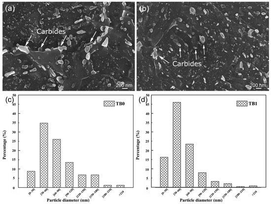 SEM micrographs of (a) TB0 and (b) TB1 steels after Q+T, and the corresponding carbide size distributions in (c) TB0 and (d) TB1 steels, respectively.