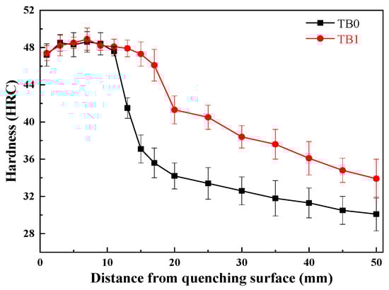 The quenching hardness curves are shown in Figure 4. To some extent, two steels with Ti and B and without Ti/B show a different hardenability. The hardness began to decrease from quenching surface at ~11 mm for TB0, and at ~17 mm for TB1, respectively. According to the requirements of the API Spec 5CT, the quenching microstructure must contain more than 95% martensite, so the minimum quenching hardness of C110 grade steel is [16]: