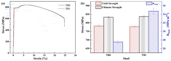 (a) Tensile stress-strain curves of TB0 and TB1 steels showing the similar mechanical properties, and (b) the values of yield and ultimate strengths and KISSC of TB0 and TB1 steels.
