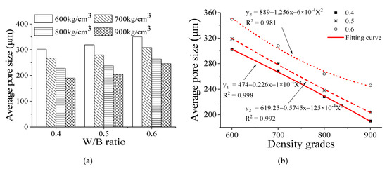 Figure 2 shows the average pores size and porosity of the foam backfill material with different density grades and water–binder (W/B) ratios. The average pore size of the foam backfill material with different density grades is increased with increasing water–binder ratio. For example, the average pore size of the foam backfill material with a water–binder ratio of 0.50 and density grades of 600–900 is increased by 5.6%, 4.5%, 4.4%, and 7.4%, respectively, compared with those with a water–binder ratio of 0.40. The corresponding average pore size of the foam backfill material with a water–binder ratio of 0.60 from grades 600–900 is further increased by 9.7%, 10%, 10.9%, and 20.6%, respectively. Apparently, the increment of the average pore size for the water–binder ratio from 0.40 to 0.50 is lower than that for the water–binder ratio from 0.50 to 0.60. These results are also significantly performed on the regression map (Figure 2b). It can be seen that the R2 of the W/B ratio of 0.40 and 0.50 is higher than that of 0.60. Their significant values are 0.998, 0.992, and 0.981, respectively.