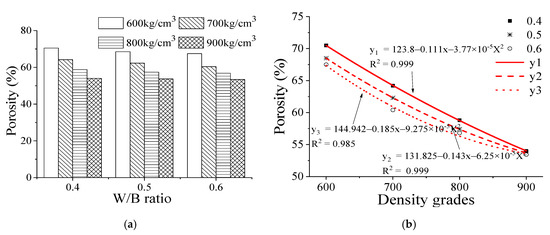 Effect of water-to-binder ratio on porosity of the foam backfill material at different density grades. (a) W/B ratio; (b) density grades.