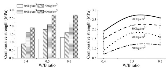 The compressive strength of the foam backfill material in different density grades as a function of the water–binder ratio is shown in Figure 4. At a fixed water–binder ratio, the compressive strength of the foam backfill material increases gradually with increasing density grades. For instance, at a water–binder ratio of 0.40, the compressive strengths of the foam backfill materials from density grades of 600 to 900 are 0.7 MPa, 0.9 MPa, 1.5 MPa, and 1.95 MPa, respectively, which are respectively increase by 28.6%, 114.3%, and 178.6%.