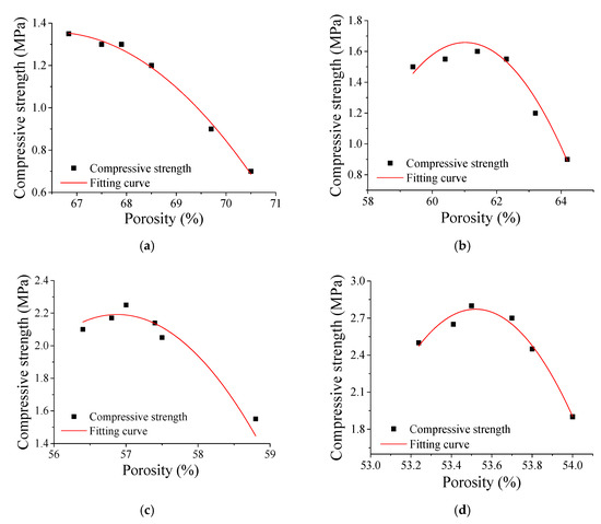 Correlation between porosity and compressive strength. (a) 600 kg/cm3 foamed concrete; (b) 700 kg/cm3 foamed concrete; (c) 800 kg/cm3 foamed concrete; (d) 900 kg/cm3 foamed concrete.