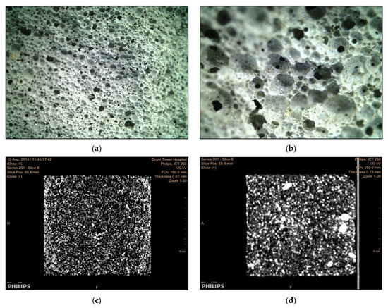 Pore morphology of the foam backfill material with different W/B ratios. (a) 0.40 W/B ratio, (b) 0.50 W/B ratio, (c) 0.40 W/B ratio through the CT scan, (d) 0.50 W/B ratio through the CT scan.