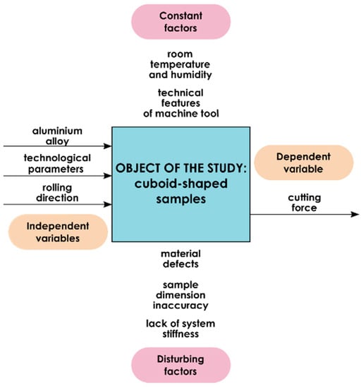 Figure 1 presents the research plan. The cuboid-shaped samples of the following dimensions: 20 mm × 20 mm × 64 mm were defined as the research object. The independent variables were technological parameters, rolling direction and aluminium alloy, while the dependent variable is cutting force. The constant factors include the technical features of the machine tool as well as temperature and humidity of the laboratory room. The disturbing factors were material defects, dimensional inaccuracy of samples and lack of system stiffness.