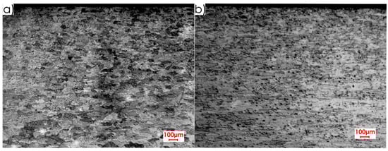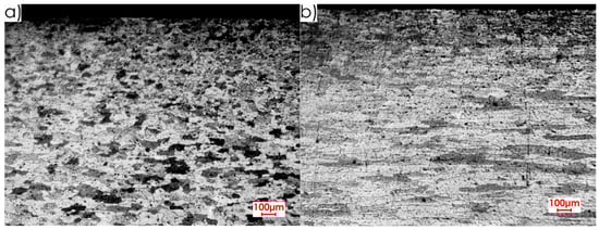 Microstructure of surface layer for EN AW-2017A T451 alloy: (a) perpendicular rolling direction, (b) parallel rolling direction (2.5× magnification).