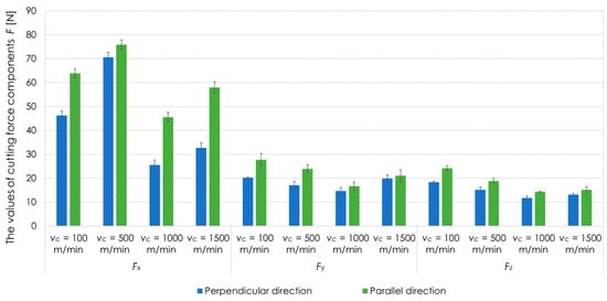 Figure 5 presents the values of the cutting force components Fx, Fy, Fz for EN AW-2017A T451 alloy and analysed cutting speeds vc at ap = 0.4 mm. The recorded values of the cutting force components are the effect of various phenomena accompanying the cutting process. The study did not focus on all components of the cutting force and did not analyse the phenomena affecting their value, but only on determining the values of the cutting force depending on the selected technological parameters. In particular, it was bothered to establish for which cutting speed vc, the cutting force has the lowest value. Lower cutting force is the result of lower cutting resistance, and thus also lower deformations and post-machining residual stresses. In the further part of the paper, the analysis of the component of the cutting force Fx, which had the highest values, in comparison to Fy and Fz, was made.