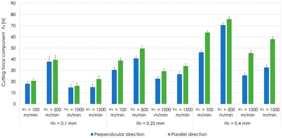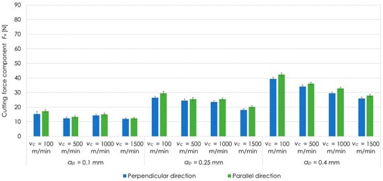 Cutting force component Fx for EN AW-2017A T451 aluminium alloy, tested cutting speeds vc, depths of cut ap as well as perpendicular and parallel milling direction in relation to the rolling direction.