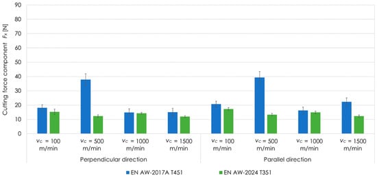 Figure 8 shows the comparison of cutting force component Fx as a function of cutting speed vc for tested aluminium alloys (EN AW-2017A T451 and EN AW-2024 T351) as well as perpendicular and parallel relations between cutting tool feed direction and rolling direction at ap = 0.1 mm. On the basis of the results presented, it can be seen that for EN AW-2024 T351, the values of the cutting force component Fx were lower in comparison to EN AW-2017A T451 for all examined cutting speeds vc and both relations between milling direction and rolling direction.