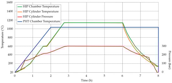 Each sample group was subjected to different heat treatment processes to reach different results, which allowed obtaining a higher amount of results and knowledge about the material. Hot isostatic pressing (HIP) was performed on a high-temperature press with furnace Nabertherm VHT 822—GR (Nabertherm, Lilienthal, Germany). Precipitation heat treatment (PHT) was done using the Nabertherm P300 furnace (Nabertherm, Lilienthal, Germany). Each heat treatment process is shown in Figure 2.