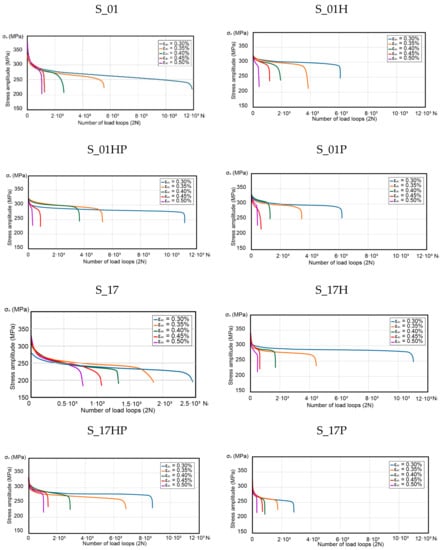 The variations of stress amplitude σa with the load loops number are shown in Figure 3, respectively, for each sample group. Additive manufactured samples (S_01, S_17 and S_30) were compared with AM heat-treated parts (S_01H, S_01P, S_01HP, S_17H, S_17P, S_17HP and S_30). All results were compared to the conventionally made material (made of cold-rolled metal sheets—described as P_0 samples).