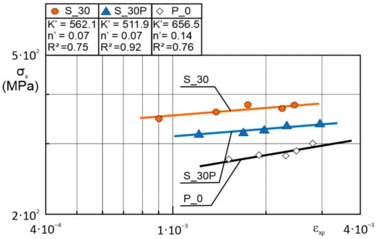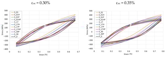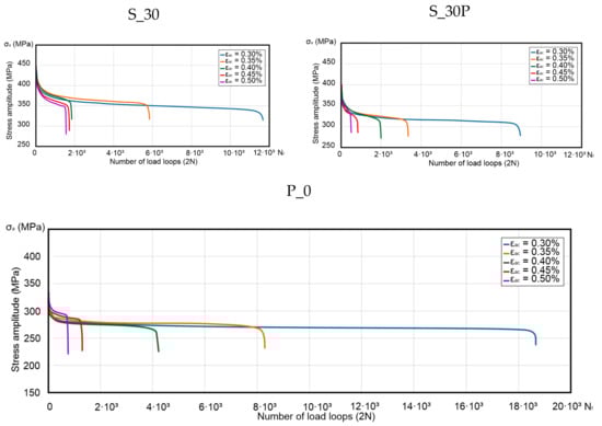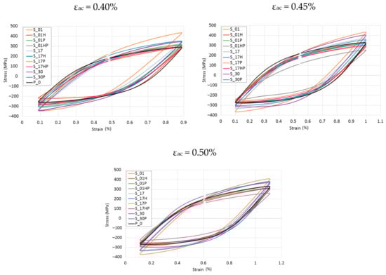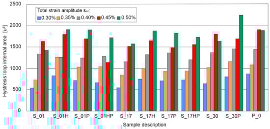 The biggest hysteresis loop area, higher by 18.5% than the P_0 samples loop area, was found during the S_30P samples tests. Other samples tested at εac = 0.50% were characterized by area range from −8.9% to 1.3% compared to the results obtained for the reference P_0 sample. In the case of the remaining samples, the observed differences in the hysteresis loop areas differed by 10–12% from the results obtained for the reference P_0 sample.