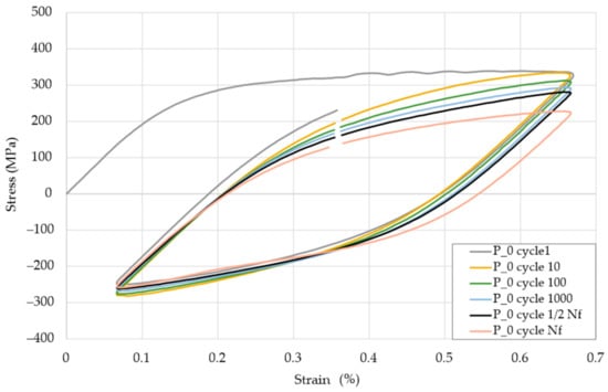 To better understand differences between additive manufactured and conventionally made material, an example of the hysteresis loop for the P_0 samples in εac = 0.3% strain condition for the peak/valley stressed of characteristic fatigue life cycles was shown in Figure 5. The course of the lower stress values did not change much, while the upper peaks with the number of cycles significantly decrease. The no. 1 cycle in the initial phase showed some irregularity, which may have been related to the compression of the sample in the testing machine holder. This cycle should not be analyzed. The shape of the hysteresis loops was fully regular during the cycles.