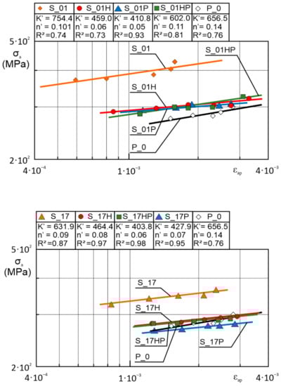 - The values of stress amplitude σa versus the number of load reversals showed much smaller changes of stress amplitude in the entire range of load cycle number N than in the case of non-heat-treated samples (less tendency to weakening of the material). In samples S_01H, S_01P, and S_01HP, the cyclic weakening stage is transient;