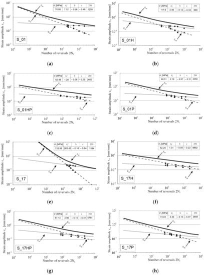 Obtained results (Figure 8) allow stating that heat-treated additive manufactured 316L steel had a significant share of the plastic component during the destruction process; however, in the case of most samples, this share was significantly lower than in the case of non-heat-treated samples. It was particularly visible in the graphs concerning the samples S_17H (Figure 8f), S_17P (Figure 8g) and S_17HP (Figure 8h), where the angles between the lines corresponding to the amplitude of the plastic component εap and the amplitude of the elastic component εae were much smaller than in the case of the as-built sample S_17 (Figure 8e).