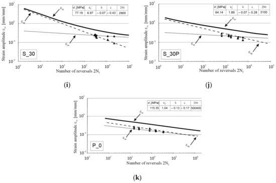 Number of half-cycle reversals vs. strain amplitude in log–log coordinates for as-built samples, heat-treated and conventionally made material ((a)—S_01, (b)—S_01H, (c)—S_01HP, (d)—S_01P, (e)—S_17, (f)—S_17H, (g)—S_17HP, (h)—S_17P, (i)—S_30, (j)—S_30P, (k)—P_0).