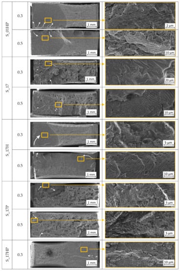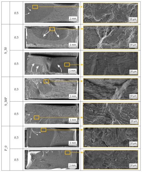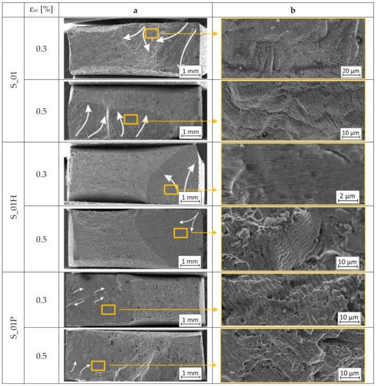 Fractographic observations were made for all parameter groups (S_01, S_17, and S_30) and all heat-treated combinations of samples with additional analysis of conventionally made material. Fracture images of samples tested under two conditions: εac = 0.30% and εac = 0.50% are shown, respectively. The column “a” shows the entire fracture area and the crack propagation direction, marked using white arrows. In column “b”, there are selected areas of the enlarged fractures.