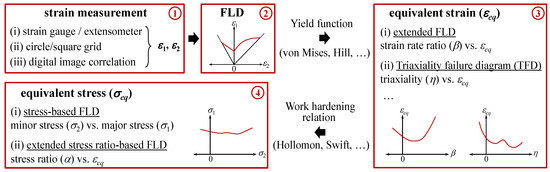 Generally, during forming, sheet metals are deformed along a nonlinear path. However, because the FLC assumes a path dependence, path-independent forming limit criteria are required in multistage deep-drawing forming or hydroforming processes for most of the sheet materials. As such, various forming limit criteria have been developed to overcome the dependence of the FLD on the strain path. Figure 1 shows a schematic diagram of the process of developing path-independent forming limit criteria applicable for in sheet metal forming. While stress measurement is very challenging, the strain can be measured easily using strain gauges, extensometers, and grid markings. With the development of digital image correlation (DIC) technology, displacement and strain can be more accurately measured through image analyses based on time increments. Forming limits can be obtained using the experimentally measured strains in the major direction (ε1) and minor direction (ε2) for various strain patterns. In addition, by applying the appropriate yield criterion and hardening law to the obtained strain value, it can be converted into effective strain (εeq), effective stress (σeq), triaxiality (η), and other parameters and can be expressed in terms of various path-independent forming limits. During a tensile test, diffusion necking begins at the maximum load point, but the forming limit should be obtained based on local necking. Therefore, the material model for sheet metal forming should account for the stress–strain behavior of the material, including the uniform elongation, local necking, and fracture. Previous studies have shown that various empirical stress–strain relations such as the Swift and Voce models can effectively extrapolate the actual stress–strain curve up to failure, which has been verified by a bulge test [13]. However, Kim et al. [14] showed that the stress–strain relationship of ZIRLO™ materials can be expressed using an empirical stress–strain relationship until diffusion necking but cannot be expressed by extrapolation after that point. Therefore, when the path-independent strain/stress-based forming limit criterion is calculated to avoid the strain path dependence of the FLD, inherent calculation errors can arise owing to the selection of the yield criterion and hardening law. Paul [15] showed that these calculation errors in the strain-based forming limit criterion are caused by the yield criterion, whereas in the stress-based criterion, they are caused by the hardening law as well as the yield criterion. When various forming limit criteria are converted based on the experimental FLD, the effect of material anisotropy is almost excluded. However, when anisotropy is extremely high, such as in case of as ZIRLO™ materials, it must be considered while calculating the forming limit.
