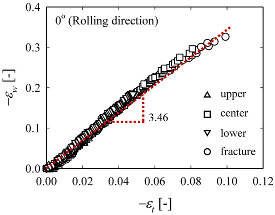 Figure 4 shows how εw and εt, which were measured at different points until the RD specimen breaks, evolves over strain, where δ represents the tensile test displacement and δmax represents the displacement at the break. The measurement locations are the center of the specimen (□), a point 15 mm above and below the center of the specimen (△,▽), and the actual fracture point (○). In the ideal tensile test, the center of the specimen and the fracture point should coincide, but in the actual test, there are cases where they do not coincide due to various reasons. As shown in Figure 4, the evolution of εw and εt at each point proceeds identically, but the absolute size changes as the local necking begins, while the ratio (εw/εt ≡ r) is maintained the same (Figure 5). The negative representation of the legend in Figure 5 means that the width and thickness of the specimen decreases during the tensile test. Figure 6 shows the evolution of εw and εt obtained from the fracture points of RD, DD, and TD specimens. Regardless of the angle with respect to the rolling direction, εt values of all specimens increase similarly, while εw value of the TD specimen is the largest and that of the RD is the smallest (TD > DD > RD). The average values of r0, r45, and r90 were obtained in the five tests for each specimen and they are 3.46, 5.28, and 5.74, respectively. Furthermore, was calculated using Equation (3) and it was 4.94, which indicates that ZIRLO™ is a material with very high anisotropy compared to other metallic materials.
