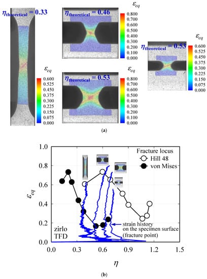 To validate the accuracy of the TFD calculations shown in Section 3, tensile specimens capable of showing various stress states were prepared as shown in Figure 10, and the TFD curves of these specimens were obtained. The same 0.48 mm-RD plate made of ZIRLO™ was used as previously used to obtain the FLD. Specimens representing specific ηtheoretical values were referenced from previous studies [33,34]. At this time, the ηtheoretical values represented by each specimen are 0.33, 0.46, 0.53, and 0.55, respectively. The appropriate specimen shape for each stress state maintains a constant η value at the center of the specimen until fracture, which was verified by FEA or experiment. The DIC method was applied in the same manner where the anisotropy coefficient was obtained in the tensile test, and 1000 frames per second were measured using two CCD stereo cameras. The strain measurement was performed using the ARAMIS 2019 [21] program, and multiple images taken for the full field during the test allow accurate capturing of the fracture point as well as local strain measured at that point. Figure 11a shows the distribution of εeq just before fracture of each specimen, whereas Figure 11b shows the η vs. εeq curve obtained at the fracture point, which is overlapped in Figure 9. Comparing the TFD converted from FLD in consideration of anisotropy with the experimental fracture limit obtained from the specimen shown in Figure 10, it is almost the same as shown in Figure 11. When determining η in experimental studies related to TFD, in Equation (9) is assumed to be 1. In the case of uniaxial tension in isotropic materials, theoretically η = 1/3 as σ1 = σeq and σ2 = 0, while in the case of plane strain tension, η = 1/√3. Although specimens with η = 0.33, 0.46, 0.53, and 0.55 were used in the DP980 material, the η values of the corresponding ZIRLO™ specimens are 0.41, 0.65, 0.71, and 0.72, which are larger than those of DP980. This is because the known value of DP980 is approximately 0.81–1 [35,36], which is much smaller than the value of ZIRLO™, which is 4.94. Thus, it can be assumed to be almost relatively isotropic. If the anisotropy is not considered, the fracture limit is predicted to be too low for each stress state even if the friction generated in the LDH test for obtaining the FLD is considered. Therefore, in a highly anisotropic material such as ZIRLO™, the anisotropy must be considered for the TFD conversion.
