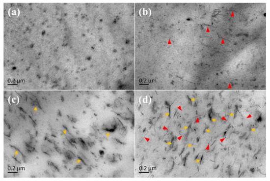 In order to clearly observe the dispersion state of CNTs and GO in the NR matrix, TEM images of the different NR composites were obtained, as shown in Figure 1. CNTs and GO sheets are marked by the red arrows and yellow arrows, respectively. The unfilled NR matrix in Figure 1a displays various black spots, which were identified ZnO particles [37]. Figure 1b shows linear CNTs that were evenly dispersed in the NR matrix, owing to the CNT bundles that were used. Figure 1c shows that the GO sheets were evenly dispersed in the NR matrix, originating from the fine dispersion of GO in the aqueous mixture and the subsequent flocculation [20]. Figure 1d shows that GO and CNTs were interspersed with each other, in a fishing net-like structure.