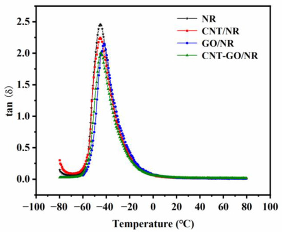 The dynamic mechanical properties of the NR composites are shown in Figure 3. Among the four samples, the unfilled NR had the highest loss factor. This is because the macromolecules of the unfilled NR moved violently once the matrix reached the glass-transition temperature. The friction between the rubber molecular chains caused very large energy losses and produced a large amount of heat. After the addition of CNTs or GO, the loss factor of the NR composite decreased because CNTs and GO restricted the movement of the molecular chains. Under the same filler content, the loss factor of CNT-GO/NR was lower than that of GO/NR. This is because the fishing net-like CNT-GO network structure tended to more strongly restrict the movement of the rubber molecular chains as compared to the restriction provided by GO sheets.