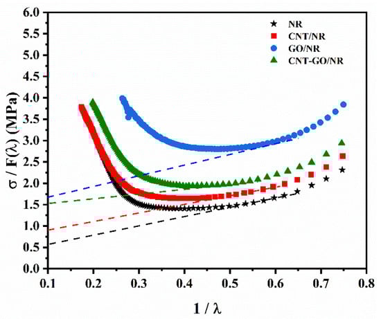 The SIC performance of NR composites has a significant effect on their crack propagation rate. Therefore, the modified Mooney–Rivlin model was used to analyze the effect of GO on the SIC performance of the NR composites. The curves of σ/F(λ) and λ−1 are shown in Figure 4, and the values of C1, C2, and λup are listed in Table 4. The value of C1 is indicative of the cross-linking density and elastic modulus of the NR composites The CNT-GO/NR composite had the highest cross-linking density among the four samples, and its C1 value was also the highest. Compared with those of pure NR, the CNT/NR composites had a lower λup value, thereby indicating that the point of occurrence of the SIC in CNT/NR appeared earlier than that in pure NR. The λup value of the CNT-GO/NR composite was even lower than that of the CNT/NR composite, signifying that the point of occurrence of the SIC appeared even earlier; this indicates that the SIC performance of the CNT-GO/NR composites was further improved by the addition of GO. The main reasons for the improvement of the SIC performance are as follows. First, the addition of GO sheets and CNT bundles led to the formation of more chemical cross-links and physical entanglement points in the NR composites. Second, the fibrous CNTs and sheet-like GO were arranged and oriented during stretching. Further, the conformational entropy of the rubber molecular chain became smaller, rendering it easier for the rubber molecular chains to orient and crystallize, thereby increasing the crystallinity of NR.