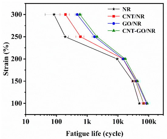 S–N curves are often used to describe the relationship between fatigue life (N) and damage factor (S). The loading conditions of rubber are generally controlled by displacement during the tests and are easy to measure; hence, strain was used as the damage factor to predict the fatigue life of the rubber composite in this research. The S–N curves of the different NR composites are shown in Figure 5 The fatigue lives of the NR composites shown in Table S1. decreased as strain increased; this is because the rubber molecular chains rapidly broke down due to the application of a large external force during the cyclic stretching process at large values of strain. Under the same strain, the CNT-GO/NR composite had the longest fatigue life among the four samples. The main reason for this result is that the filler network in the NR matrix gradually improved with the addition of CNTs and GO, which effectively resisted large amounts of external stress. In addition, CNTs and GO improved the SIC performance of the NR composites, which was critical to fatigue resistance. With the same filler content, the CNT-GO/NR composite had a longer fatigue life as compared to those of the GO/NR composites, thereby indicating that the synergy between CNT and GO positively affected the fatigue life of the NR composites.