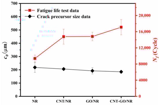 As shown in Figure 6, the crack precursor size was closely related to the fatigue life of the NR composites. The NR composite with a small crack precursor size had a long fatigue life, due to the following reasons: first, the GO and CNT introduced into the NR matrix formed a complex and strong filler network; and reduced the size of the initial defects of NR, thereby prolonging the duration of crack nucleation; second, the special structures of CNT-GO were conducive for enhancing the SIC performance of NR, which was beneficial for hindering crack growth and reducing the crack growth rate, thereby prolonging the fatigue life.