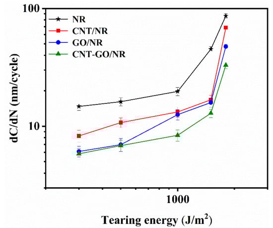 The crack growth rates of the NR composites under different tearing energies are shown in Figure 7 and Table S2. The crack growth rates of all NR composites increased with the increase in tearing energy. At low tearing energies (<500 J/m2), the crack growth rate did not change significantly, while at high tearing energies (>1000 J/m2), the crack growth rate increased exponentially. The crack growth rate of CNT/NR was significantly lower than that of the unfilled NR. When the tearing energy was 1800 J/m2, the crack growth rate reduced by 20.6%, indicating that the introduction of the fibrous CNTs was beneficial in reducing the crack growth rate of NR composites. Under the same tearing energy, the crack growth rate of CNT-GO/NR was lower than that of GO/NR, owing to the more complex network of CNT-GO as compared to the single GO network. The hysteresis energy of CNT-GO/NR was larger than that of the GO/NR composites, thereby leading to a higher reduction in the crack growth rate in the former. More importantly, the CNT and GO in the crack tips became oriented during the stretching process, which improved the SIC performance of NR and ultimately reduced the crack propagation rate of the composite.