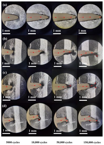 Crack propagation paths of different NR composites at 1000 J/m2 (a) NR, (b) CNT/NR, (c) GO/NR, and (d) CNT-GO/NR.