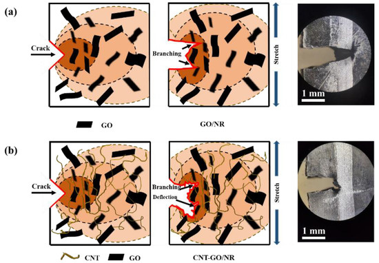 Schematic of the crack propagation in (a) GO/NR and (b) CNT-GO/NR composites.