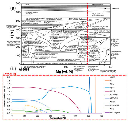 The temperature versus magnesium wt.% in the Al 6061 system considered is presented in (a) and represents an isopleth of the composition created using Pandat wherein each thermodynamically predicted equilibrium phase in the isopleth was labeled for emphasis and demonstrative purposes. The vertically dashed red line represents a magnesium wt.% of 0.9. From the isopleth in (a), the equilibrium phase fractions in Al 6061 at 0.9 wt.% magnesium as a function of temperature for the composition associated with the red line from (a) is presented in (b).