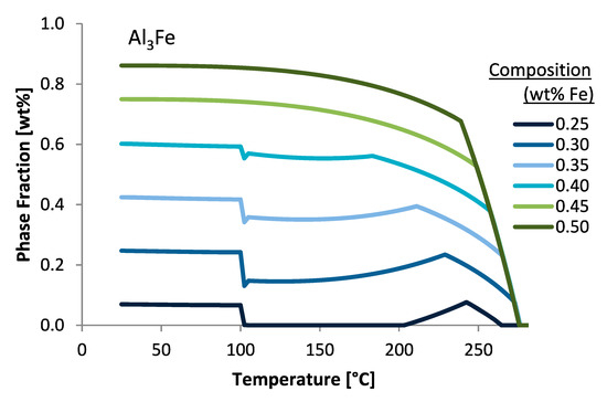 As for Figure 1b, similar thermodynamic principles were used to render the equilibrium phase fractions for Al 6061 at 0.9 wt.% magnesium content as a function of temperature. Face-centered cubic (FCC) aluminum was the primary phase, though it is out of viewing range over the majority of the temperature range depicted due to the scale of the diagram. The major secondary intermetallic phases predicted were Mg2Si, Al7Cu2Fe, and alpha, which is also expressed as Al47(Fe,Mn,Cr)11Si5. As will subsequently be considered and discussed in greater detail throughout the next section of this original research article, as well as the remainder of the manuscript, phase variation plots, via computational thermodynamic software-based inspection, can assist in observing the effect of varying alloying element and content on phase stability as a function of temperature. Such a mode of analysis also utilizes thermodynamic principles for theoretical observation. Figure 2 illustrates this mode of analysis by way of plotting the Al3Fe phase fractions predicted under equilibrium conditions as a function of temperature for varied iron wt.% compositions.