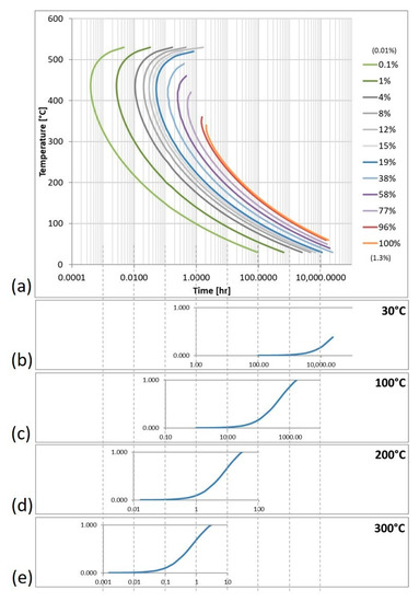 Considering the above assertion that one could imagine comparable vertical dashed lines at 0.8 wt.% and 0.9 wt.%, several different phases would be present under equilibrium conditions depending on the composition of the particular batch of Al 6061 alloys procured despite the fact that an alloy shares a common composition within a specified range. Nevertheless, Figure 1b can be contrasted to Figure 3a, which considers kinetic effects, such as diffusion behavior, to more accurately predict phases present in a system as a function of time. Figure 3a is a TTT diagram for Mg2Si in Al 6061 that was created using data derived and computed by way of employing JMatPro. These data can be further manipulated to create plots showing the fraction of Mg2Si that has formed as a function of time at various temperatures, as shown in Figure 3b–e.
