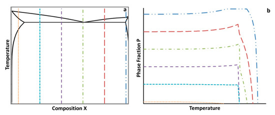 A schematic depicting the concept of the for material phases is given in Figure 4. A sketch of an isopleth is therefore shown in Figure 4a. The vertical dashed lines represent a variation in a hypothetical alloying element, which was labeled X. Figure 4b represents the resulting amount of a hypothetical, arbitrarily labeled, phase P as a function of temperature, which was calculated from a lever rule type analysis from the equilibrium isopleth. In practice, both types of diagrams for specific alloy systems can be computed and created using thermodynamic software. While the two schematics given in Figure 4 are not representative of a specific alloy system and composition, the isopleth shown in Figure 4a is somewhat comparable in shape and form with that of a castable Al–Cu binary alloy, which is consistent with the focus upon an aluminum alloy throughout the course of this work, as detailed in the Methods and Computational Thermodynamic and Kinetic Methods section of the present manuscript.