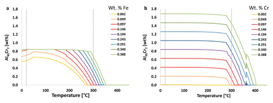 Example used to demonstrate the input for calculating s. (a) The variation of the calculated equilibrium Al45Cr7 phase in Al 6061 with iron variability. (b) The variation of the calculated equilibrium Al45Cr7 phase in Al 6061 with a content variation of chromium. The temperature of 20 °C is represented by the left-most dashed vertical line. The temperature of 300 °C is represented by the right-most vertically dashed line imposed upon the graphs.