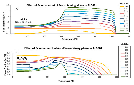 (a) The variation of the predicted equilibrium alpha phase in Al 6061 with a compositional variation of iron as a function of temperature. The graphical rendering, shown in (a), of alpha phase fractions as a function of temperature, for a range of iron contents, enabled the exploration of the effect of iron on the amount of an iron-containing phase in Al 6061. Alternatively, (b) is similar to (a); however, (b) concerns the predicted equilibrium Al13Cr4Si4 phase in Al 6061 with a content variation of iron as a function of temperature. Consequently, the graphical rendering presented in (b) of the Al13Cr4Si4 phase fractions as a function of temperature for a range of iron contents also enabled the exploration of the effect of iron on the amount of a non-iron-containing phase in an Al 6061 system.