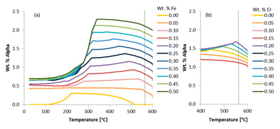 Variation of predicted equilibrium alpha phase in Al 6061 with a content variation of Fe, as shown in (a), and a content variation of Cr, as shown in (b). The temperature of 575 °C is represented by the dashed vertical lines in (a,b).