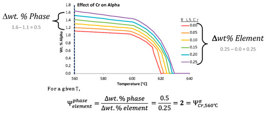 The compositional range (from −99 to +99 wt.%) for each element was divided into discrete values; thus, becoming the compositional steps. More or fewer content steps can be used, but more steps require longer computational analysis times while fewer steps may lead to less accurate results. Nine iterations were found to balance computational time and accuracy for demonstration and practical purposes using a regular computing source. It should be noted that the unit expressed as weight percent of both element and phase was chosen in this study, but atom and mole percent are equally valid. The TCAL3 thermodynamic database, in conjunction with Thermo-Calc software was used to generate the equilibrium data. One elemental composition was varied at a time, with the average elemental composition used for the remaining elements. Further, Figure 10 captures additional examples of the effects of chromium on four different phases too.