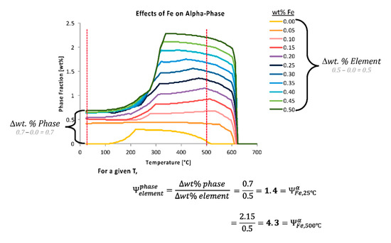 In many cases, the initial wt.% of a given phase may not be zero, which is exemplified below. Stated otherwise, Figure 8 presents the variation of the prediction of the equilibrium alpha phase in Al 6061 with a content variation of chromium according to the legend provided. The vertically dashed line superimposed upon the wt.% alpha versus temperature curves was included to signify the temperature (560 °C) associated with the embedded demonstration of the computations. Additionally, Figure 9 captures the variation in the prediction of the equilibrium alpha phase in Al 6061 with a content variation of iron according to the legend provided. Two vertically dashed lines were superimposed upon the phase fraction versus temperature curves at 25 and 500 °C to identify the temperatures associated with the embedded demonstration of two s.