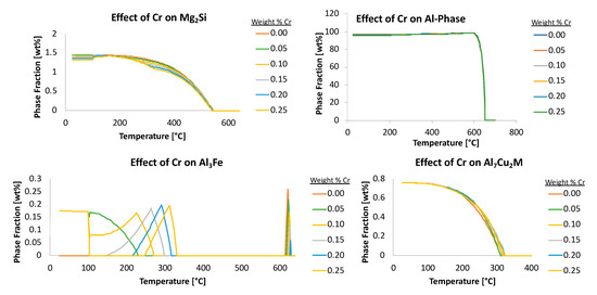 The effect of varied chromium content on the phase fraction of the Mg2Si, the aluminum matrix phase, the Al3Fe, and the Al7Cu2M, labeled accordingly, as a function of equilibrium temperatures. The wt.% Cr values corresponding to each curve in the respective plots was color coded in accordance with the respective legends provided.