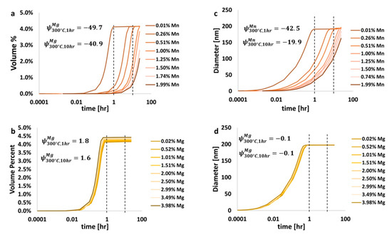 calculations of temporal precipitation properties. At 300 °C, the volume fraction, represented in (a,b), and precipitate diameter, represented in (c,d) are calculated for theta in Al-Cu-Mn, as shown in (a,c), as well as Al-Cu-Mg, as shown in (b,d).
