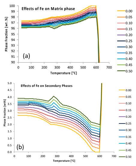 Accordingly, Figure 6 aims to not only compliment Figure 5, but to also present two additional inspections of the effect of iron, in Al 6061, on another iron-free phase other than Al45Cr7, namely Al13Cr4Si4, as well as the effect of iron on the iron-containing phase referred to as alpha. Such analysis is consistent with -inspired inspection and the quantitative assessment method. More specifically, Figure 6a presents the variation of the predicted equilibrium alpha phase in Al 6061 with a content variation of iron as a function of temperature. Interestingly, the graphical rendering of the alpha phase fractions, as a function of temperature for a range of iron contents, as shown in Figure 6a, enabled the exploration of the effect of iron on the amount of an iron-containing phase in Al 6061. Alternatively, the Figure 6b plot is similar to the Figure 6a plot; however, Figure 6b concerns the predicted equilibrium Al13Cr4Si4 phase in Al 6061 with a compositional variation of iron as a function of temperature. Consequently, Figure 6b presents the Al13Cr4Si4 phase fractions as a function of temperature for a range of iron contents, thus also enabling the exploration of the effect of iron on the amount of a non-iron-containing phase in an Al 6061 system.