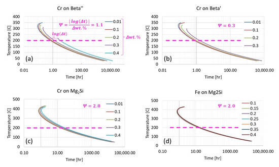 Having returned to Al 6061 in Figure 12, after tangentially considering the ternary Al-Cu-(Mn,Mg) systems in Figure 11, Figure 13 continues to pursue enhanced analysis of Al 6061 via kinetic modeling modalities. As a result, -like assessments were successfully applied to TTT diagrams for β″, β′, and Mg2Si at 200 °C from the vantage point of increments of 0.01 wt.% chromium to 0.3 wt.% or 0.4 wt.% Cr depending upon on the metastable or stable phase(s) under consideration. At the same time, the associated with the effect of iron content on the Mg2Si TTT behavior was provided for comparison with chromium’s respective influence. From -inspection of Figure 13a, in comparison with Figure 13b, which corresponds with the influence of chromium upon β″ and chromium upon β′, respectively, chromium was found to have a more significant influence upon β″ formation than that of β′ formation with a nearly three times greater than the associated with chromium’s effect on β′. As for chromium and iron in relation to Mg2Si, chromium was found to have a greater at 2.8 versus that of 2.0 for the effect of iron on Mg2Si under the same conditions. Remarkably, the observation that chromium attains a greater in relation to Mg2Si as compared with the influence of iron on Mg2Si is consistent with relatively recent experimental findings too. Stated otherwise, the fact that is consistent with Kassner et al.’s assertion that “chromium may increase Mg2Si concentration and nucleation rate in 6xxx series aluminum alloys during a study of the quench sensitivities of 6061-T6 and other 6xxx series alloys” in [31]. Finally, Figure 14 computes the hardness associated with the variation of magnesium content in the Al 6061 alloy and as a function of the initial solidification cooling rate too.